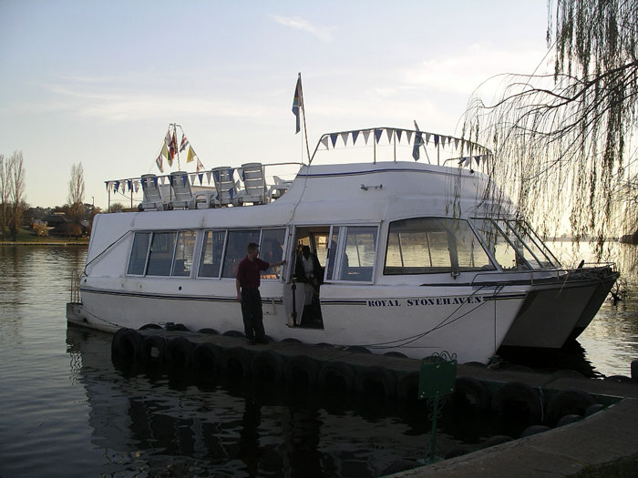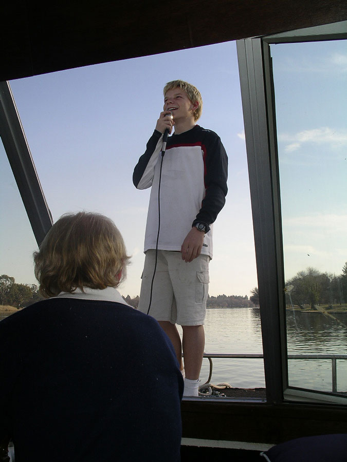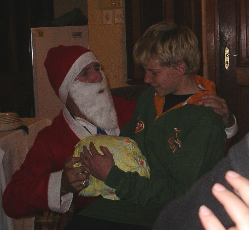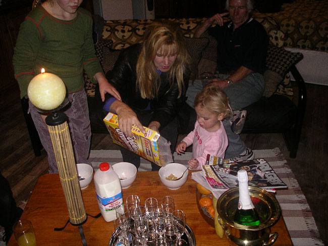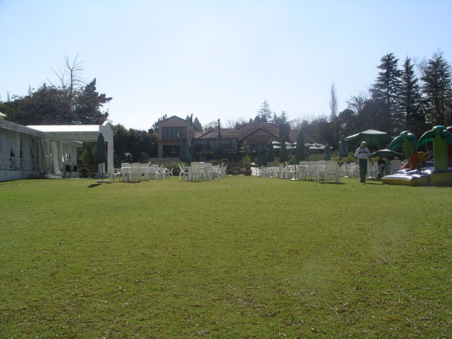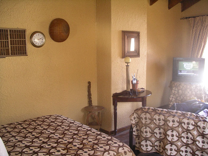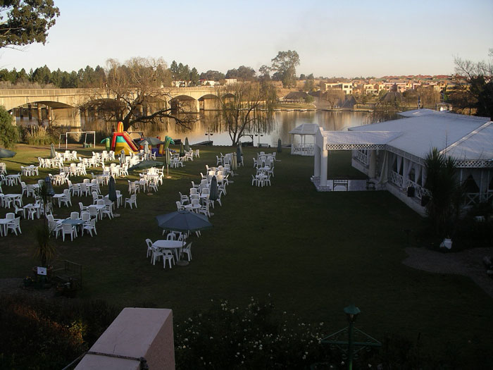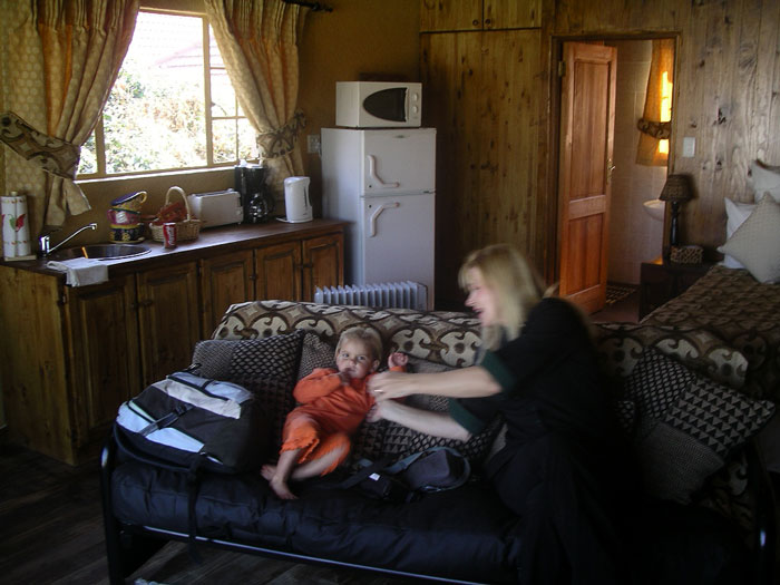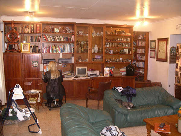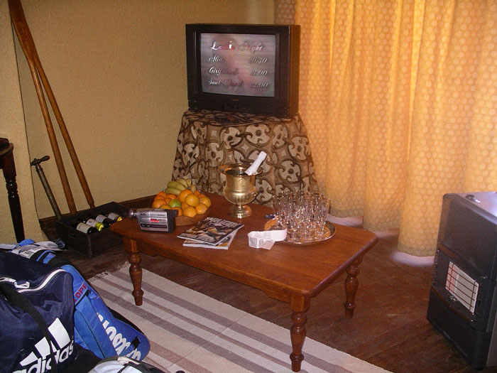 Weve set up my workspace just to the right of her, so Im there to help her with computer things and other projects. We share printers and the phone. As you can tell from the photo, our workspace is smack-dab in the middle of their living room, so its never very peaceful, but thats OK. In the mornings we usually keep CNN on the TV, so we hear world news in the background while we do other things. Its usually just Larry King interviewing Martha Stewart or something. This week seems to be griping (yawn) coverage of the Democratic Convention. Sheesh, sorry Im missing out on that! Sarah-Pat has a nanny (not sure what they call her actually) who keeps tabs on her all day, and sometimes she makes us turn CNN off for a Barney tape. Rex has a small corner office just off to the right in this picture, so hes never far away either. We dont really sit there and work for too long ever, as we go over to the Pub, or out to the accounting shed (office) or out to look at the lawn (thats being re-sod next week) or off to some other crisis. Midmorning, Rosemary will usually heat us up a chocolate muffin and make tea. She knows well the importance of my regular feedings! Sometimes at noon we will order lunch from the restaurant, but more often, I go upstairs to my room and have a couple of peanut butter sandwiches (and more yummy juice!). The afternoons, I usually give computer lessons to a couple of the staff members, teaching them to do things on the computer to take pressure off of Rosemary, and to do while shes out of town, of course. John and Storm get home from school about 4pm usually, and we help Storm with her homework, or I go out and kick the rugby ball with John, and take Guinness for a play session down by the river. We re also still working through that time usually. We usually order dinner from the restaurant and watch some TV all of us together. They really dont watch much TV here (at least not as much as we Americans do), but theres usually one show each night the kids love to watch. Smallville, Everwood, Friends, The Simpsons, or a rugby match usually. Some nights Ill go sit in the Pub and eat dinner and read the paper there, visit with the staff some. I think they just like to hear me talk, doesnt matter what I say. Most of the staff speak Afrikaans as their first language, and amongst themselves, but their English is very good, though heavily accented. I have to listen very carefully and often get them to repeat themselves. I try to learn a word of Afrikaans here and there. Im not much of a bar person anyway, and everyone here smokes, it seems. But the fireplaces in the Pub are so warm and cozy, I do enjoy them. I think though, I will enjoy the atmosphere there more when it gets warm and all the doors and windows are left wide open at all times. I usually am in bed asleep by 10pm or so. I have a TV upstairs in my room but hardly ever even turn it on. Tonight Im watching a mens tennis match live from the US, Safin-Kiefer (its on one of their sports channels, and no commercials!), but I think this is the most Ive had my TV on at all.
