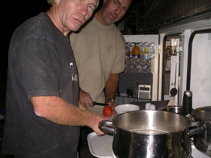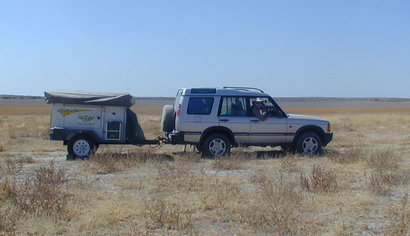 Our heads swiveled around like Linda Blair in The Exorcist, and sure enough, no trailer. Rex started madly flashing his headlights at our partners traveling ahead of us to signal trouble. They were obviously not paying attention to their rearview mirrors and silently drove off into the darkness. Gee thanks. So there we were, completely alone. Its funny how in a crisis like that, you just kick into another gear, and do what needs to be done. Rex began reversing down the narrow track we were on, and we could barely make out the trailer in the distance, about 50 meters behind us. It had gone nose-first into the sand, and as we reversed and approached it, it looked like the whole front apparatus had just snapped off of it. Rex stopped the car and we all got out and ran to it like it was a fallen family member, which it basically was at that point. Without even talking to each other, we just jumped into action. Rosemary and Storm jumped on the back of the trailer to provide leverage to lift it. Rex, John and I dropped to our knees and started digging in the sand like dogs. We were frantic to see if our trailers hitch had broken or if it had just slipped off the cars hitch. The only light we had was from our rear taillights. We summoned incredible hulk-like strength and dug and lifted it out of the sand. It was completely intact. It had just slipped off of our hitch, and the safety chain hadnt held. For once today, something went our way. In mere minutes, we had reattached the trailer, jumped back into the car and sped off (as much as you can speed on a road like that, which isnt very much) to try and catch up with our dear, concerned (not!) friends up ahead. The good news is, we eventually ran into one of them who had turned around to come look for us. The bad news is, the lead car was dead again up ahead, his trailer hitch fractured. Like I said, this just was not his day (or night!).
