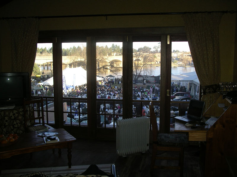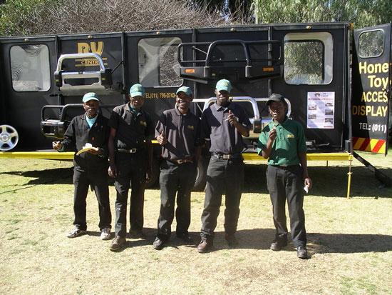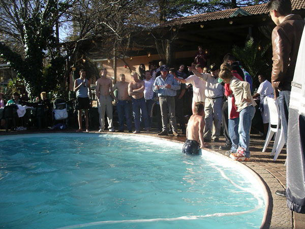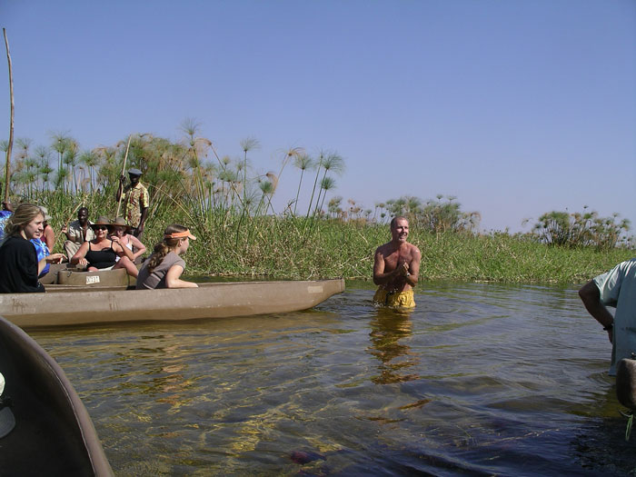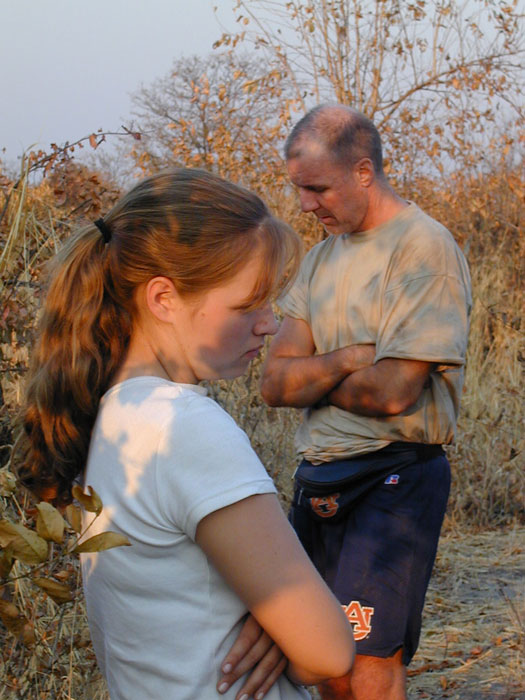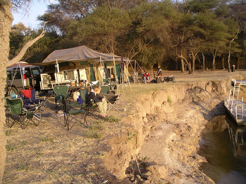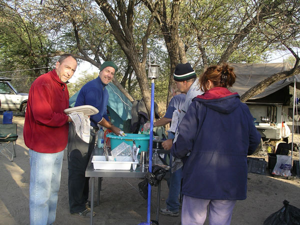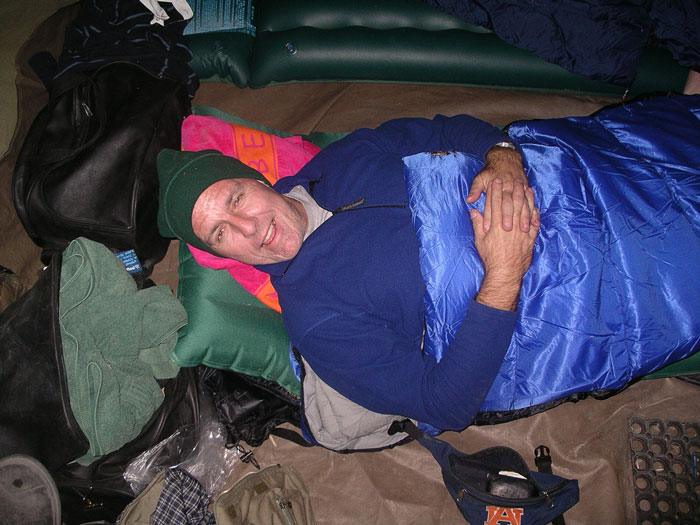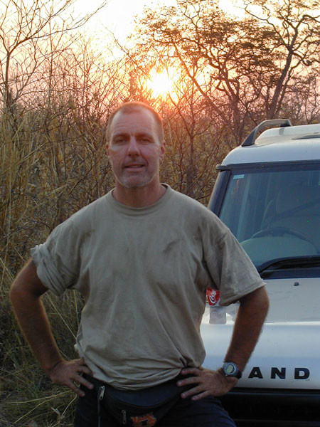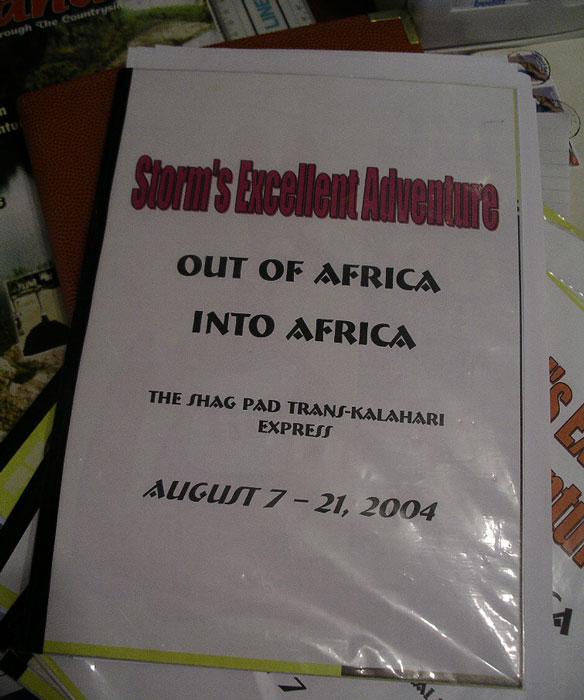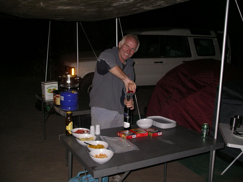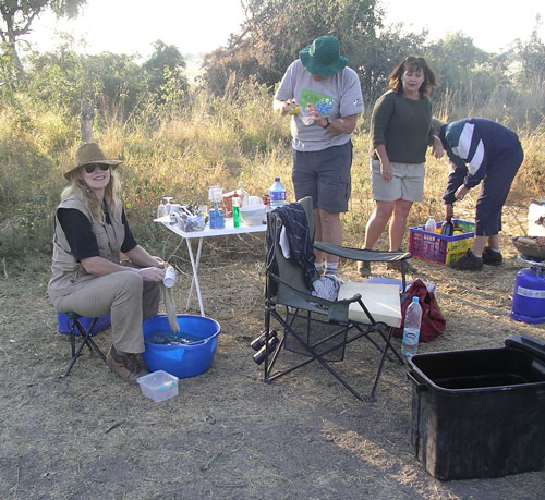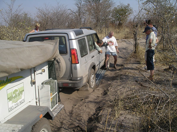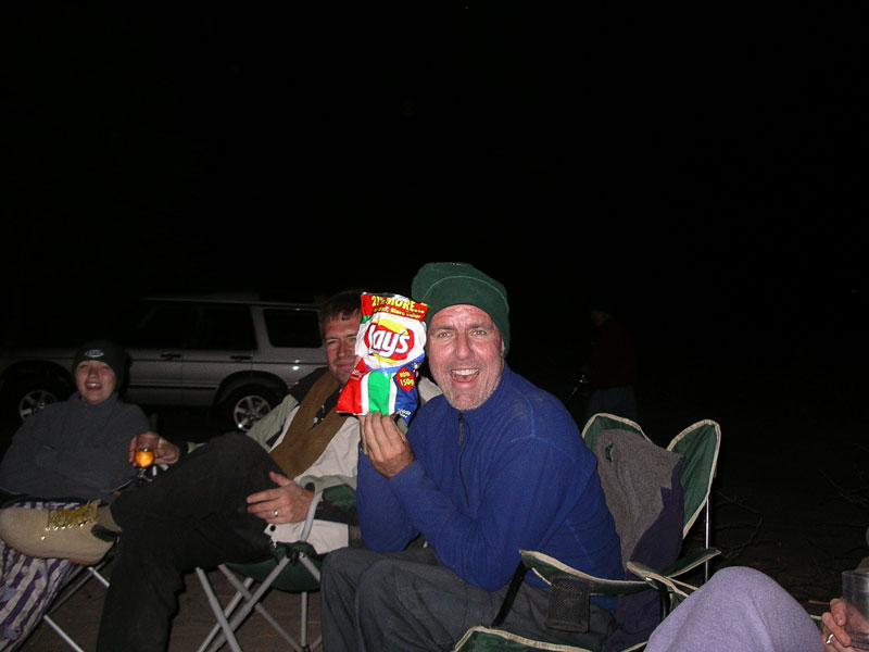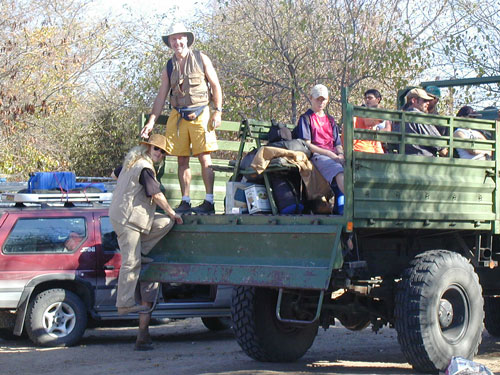 Our engineer crew set to work once again. I held the flashlight once again. Like something out of that old TV show (Night Rider?), they took a piece off of our one car that wasnt pulling a trailer and mended the fallen trailer enough that we could proceed forward, although only at slow speeds. The rest of the night, we drove at 5-10mph, painfully eeeeaaasing over every bump we came to. Which was fine with us and Storm especially, as it meant our trailer was less likely to disappear again (although we now rode in second place so no one would leave us behind if it did!). We had to stop twice more along the way when the lead cars damaged trailer fell off. Each time, our engineers patched things, and again we would be off into the night. At 12:38am, after covering the extra 28 miles, we arrived at our camp where the others were waiting. (They actually ran out to the camps gates to meet us, because through the clear quiet African night, they had heard us and seen our headlights in the distance over 20 minutes before we arrived) Bless their hearts, they had made arrangements for us all to sleep in the lodge that night, and not have to set up our tents, etc. We hadnt had food or drink since about 4:30 that afternoon, but a quick soft drink to quench our thirsts, and we were out like lights. I slept on the floor of our room and have never slept better on a hard, wooden floor in my life. I would have thought my adrenaline would have kept me awake, but as we all hit the sack, Rosemary and I got very tickled re-living the day, and had one of those laughing attacks where your stomach aches and you cant catch your breath. I think that sent me right off to sleep. Like I said, its important to always keep ones sense of humor.