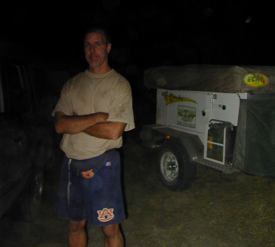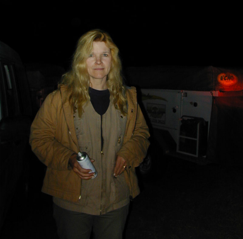 Getting close to sunset now, and the lead car once again met disaster; a flat tire. Another group effort ensued, and we had the tire changed and were ready to go again. While fixing the flat tire, we noticed his trailer hitch had a loose bolt. We made a mental note to check that and tighten it that night at camp. Not such a good strategy, in hindsight.