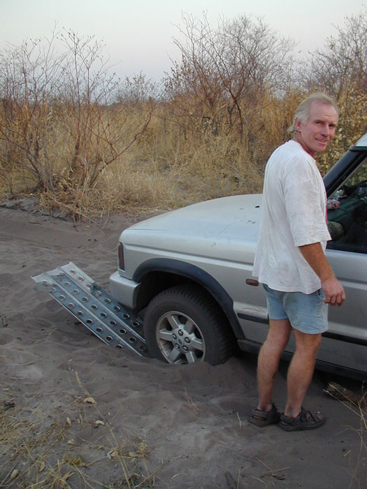 About an hour after lunch, the roads had become sandier. We met a couple of travelers coming the other way who had gotten stuck in the sand. It was one of those stretches where the road had split into 2 tracks, one track being better than the other. They had picked the wrong track and had been stuck there about 2 hours when we came along. (It was a nice couple from Capetown, and he was a psychologist on sabbatical and working on a dissertation about what happens to the human psyche when we are put out in the wild on our own, away from our familiar surroundings. Boy could I write a chapter or 2 in that one!) We got our sand mats down and worked with them for about 45 minutes before digging them out and sending them on their way. 45 precious minutes we would want back later. But on we trudged.