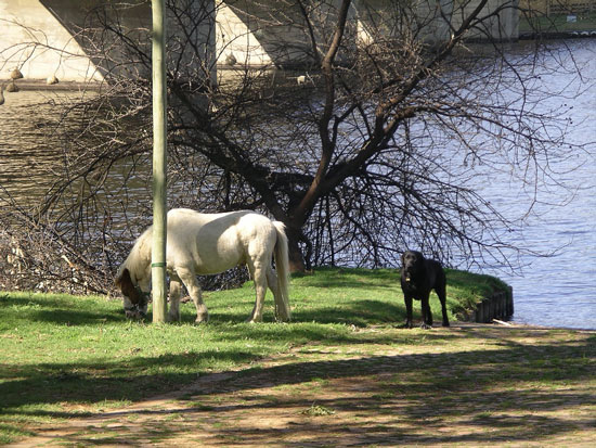 Kali the Great Dane puppy also took her first dip in the river this week, quite unexpectedly, at least to me. I had walked her down to the river and I was sitting on a jetty watching the sunset, while she sat there with me. Out of the blue, she decided to dive in and I mean dive. And with her sleek divers body, she went straight down! There was a few second pause (probably 1 second, felt like about 30!) where I did not think she was coming up and I was thinking Oh great, my first swim in the Vaal River (and the water is still kinda ice cold!) is going to be to the bottom looking for this damn dog. But she finally surfaced wide-eyed and panicked, and started paddling, fortunately towards me. She latched on to one of the rubber tires that protect the jetty (see the picture above) and clung to it for dear life. Im not sure how I did it, but I managed to lie on the jetty, reach down and pry her front paws off the tire, and pull her up. Guinness was there, but was no help at all --- he just thought this was a great game we were playing! (he swims in the river daily). Here is a picture of me and Kali (I woke her up from a nap for this picture):