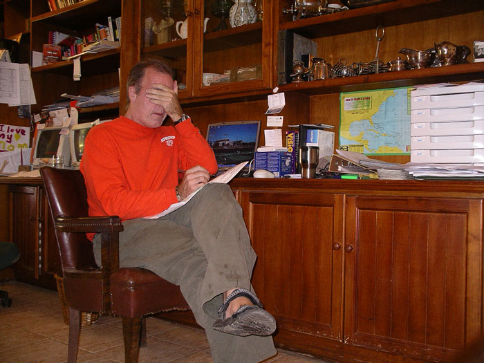 There is a small corner of the Accounting office where I do some work sometimes, on the new time clock system, and other projects going on. Yesterday they decided that little corner where I work was too dark, so they put up a new light. The new light is so bright, I am sure it can be seen from space at night. So today I walked in and put on sunglasses to make a point. Kali (the growing Great Dane) had to get some morning loving from me at the same time (yes, big muddy feet and all).