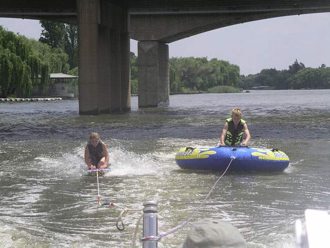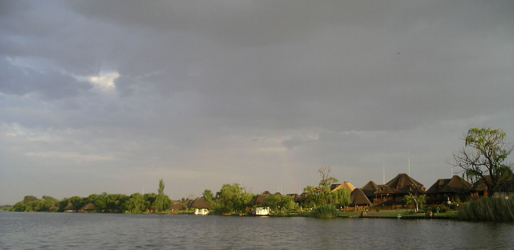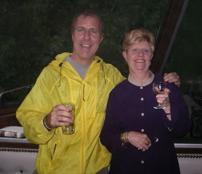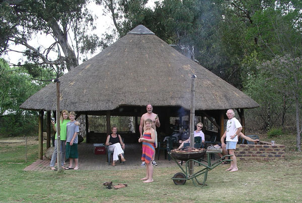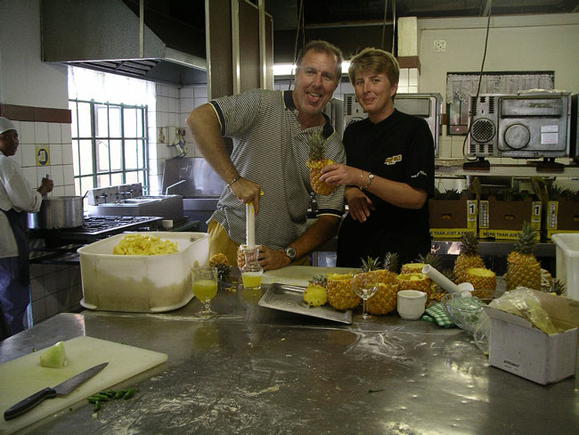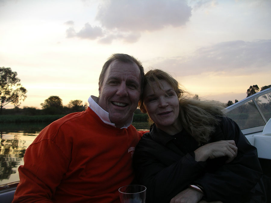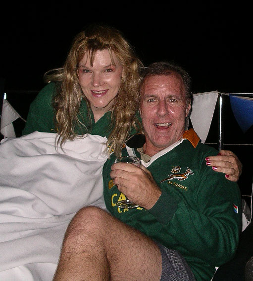 We have been very dry here, and in need of rain, so when the thunder started late Wednesday afternoon, it was welcomed. Pretty soon though, there were chunks of ice falling from the sky. Not great timing, as we were all getting ready for a nice retirement dinner cruise on the river for one of the staff here, Carole. Carole has worked here since Stonehaven began as a business in 1994. She and her husband Tom are friends of Rex and Rose from way back (about 1976). They are British, but lived in Zambia for 7 years before settling in South Africa in the mid-70s, so they have an interesting background. Here is a picture of Carole and myself at a braai in 1984: