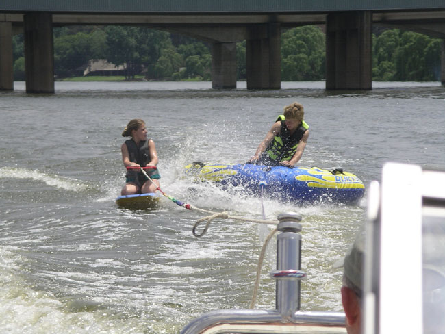 It was not a great evening for a dinner cruise on the river, but we made the most of it. The hail subsided but it rained throughout the evening, so we stayed inside on the boat. Later in the evening (after midnight), more hail came and did pretty severe damage to parts of town near here, but fortunately spared Stonehaven and especially Rosemarys rose bushes.